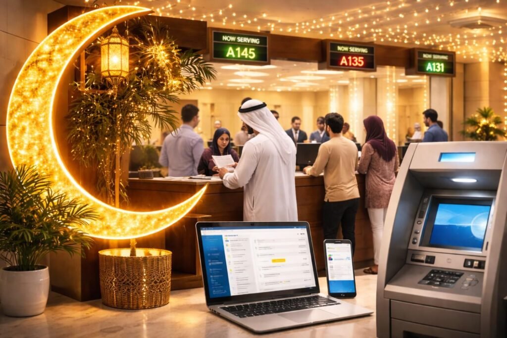 ATMs operate 24/7 as always. Online banking faces no restrictions. If you can handle transactions digitally, that’s your best option during Ramadan.